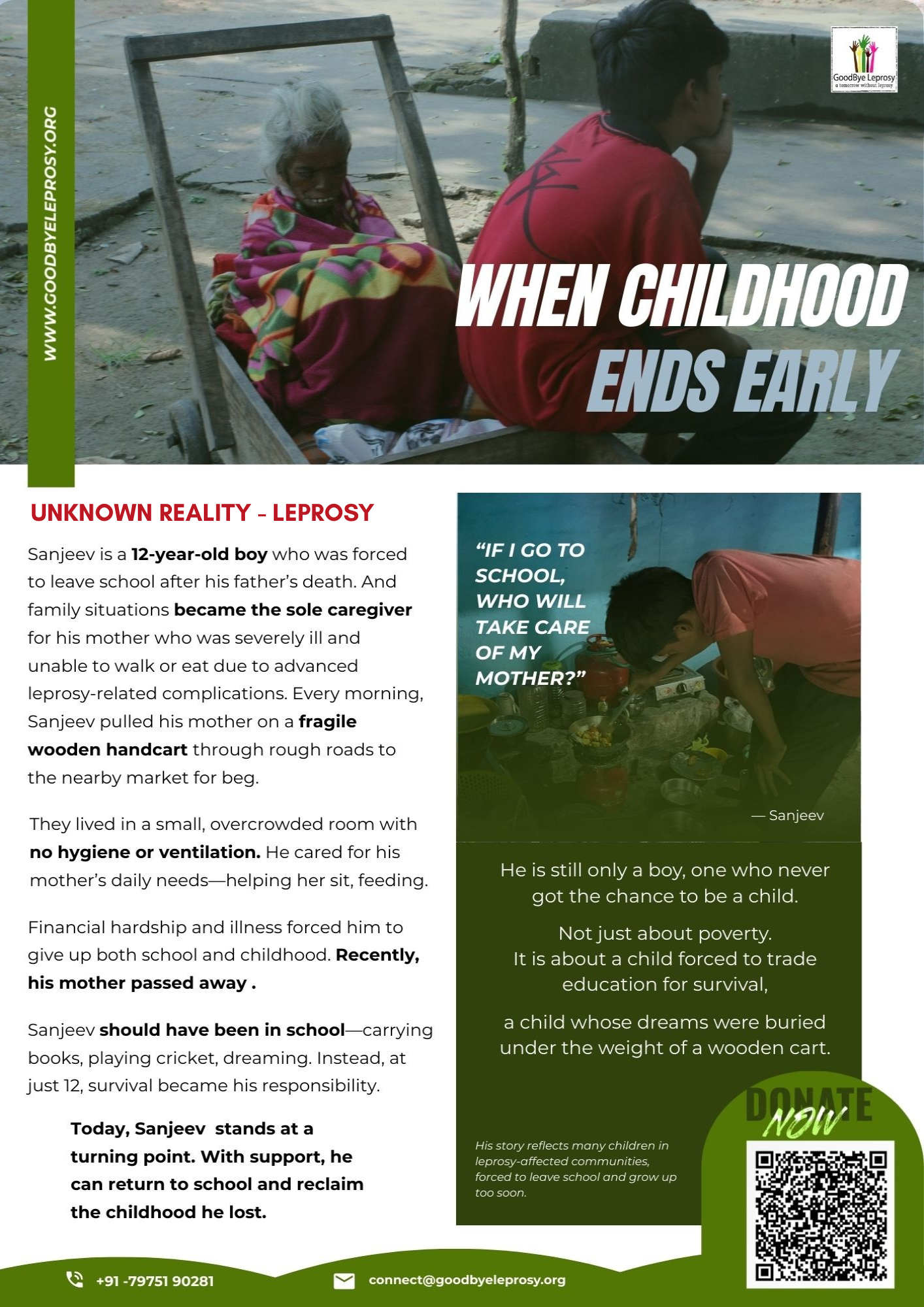 Sanjeev is a 12-year-old boy who had to leave school after his father passed away. With his father gone and the family struggling, Sanjeev became the primary caregiver for his mother, Pushpa Devi, who was severely ill and unable to walk or eat properly due to her advanced leprosy-related complications.